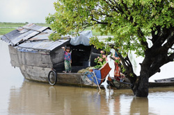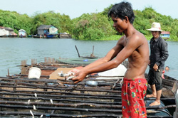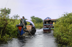 קמבודיה, יותר מכל ארץ אחרת מתקיימת בזכות מי-המקונג. אגם טונלה הוא אגם רדוד בלב המדינה, המהווה חלק ממערכת של תעלות המבוססות על זרימת מים מאזור גבוה לאזור נמוך ועל גאות בעונת המונסונים. שיטה פשוטה זו ממתיקה את מי הנהר ומאפשרת שימוש במים לאורך כל השנה וכן משפרת לאין-שיעור את היבול החקלאי ואת איכות הדגה, הן בקמבודיה עצמה והן בדלתא של וייטנאם. לגדותיו של האגם, חיים אלפי אנשים במעין ספינות שהפכו לבתים, ועל-כן מקומות מגורים אלו זכו לכינוי: "הכפרים הצפים". בשעות הערב העברה לשדה התעופה.